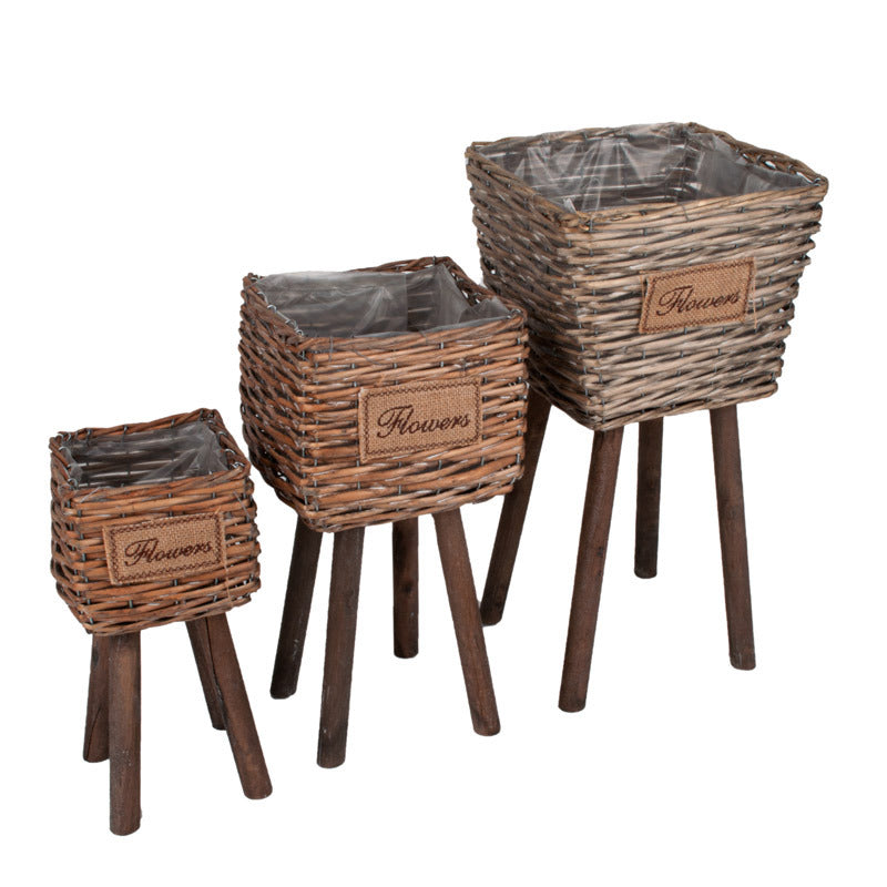 Castron De Răchită Cu Fantă Pătrată Pe Picior De Lemn Cu Inscripție Flowers Maro 26,5X24X20/48,5Cm S/3